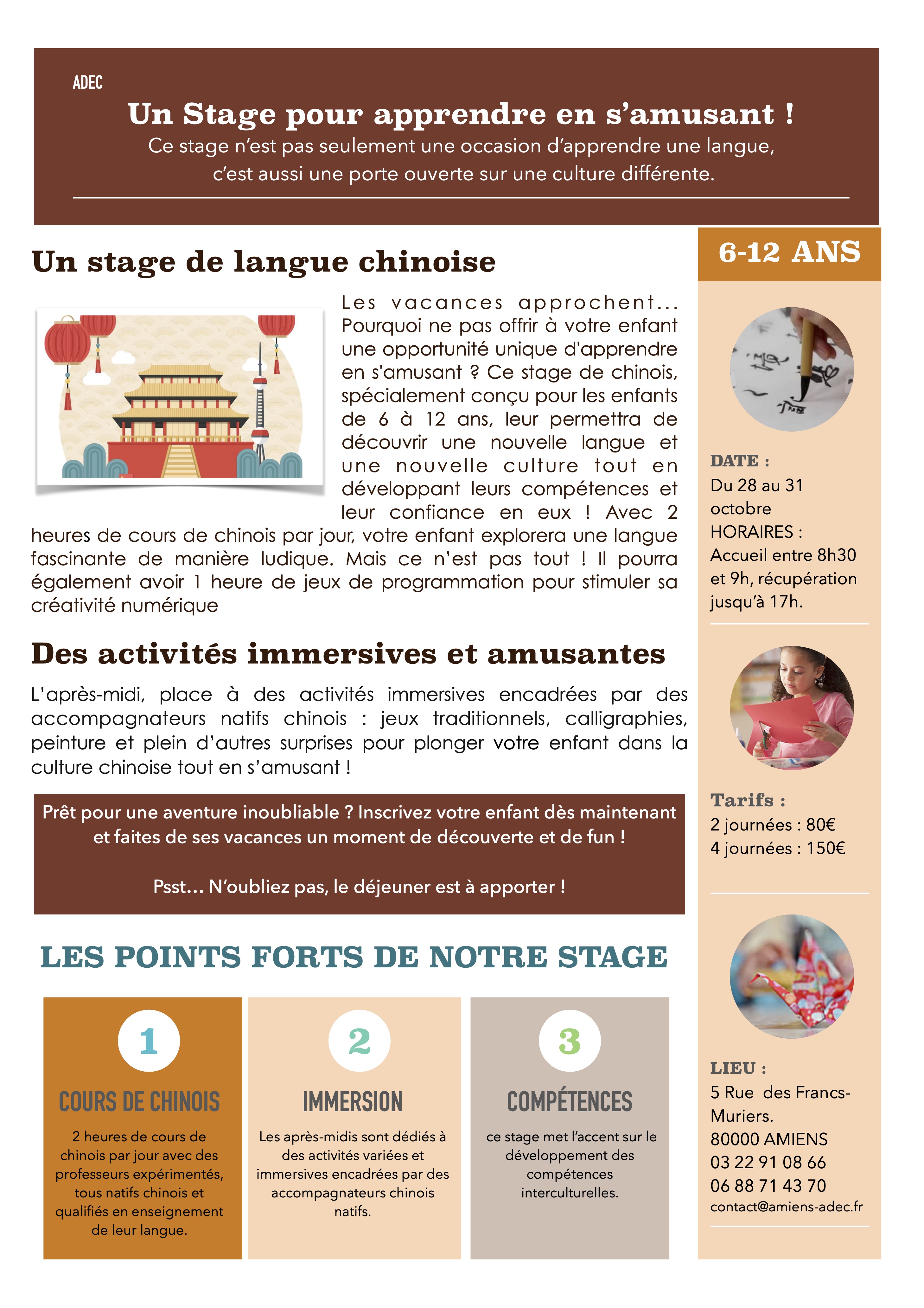 Il n'est jamais trop tard pour débuter l'apprentissage d'une langue... L’ADEC vous propose un stage d'initiation au mandarin en petit groupe, à suivre dans l'optique d'un voyage, ou par simple curiosité !